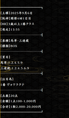 実際に初戦の結果をレビュー形式でご紹介していくので、まずはじめに買い目と選んだ馬をご覧ください。