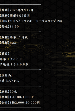 公開された買い目と、麒麟が選んだ馬の概要をご覧ください。