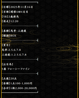 公開された買い目と、麒麟が選んだ馬の概要をご覧ください。