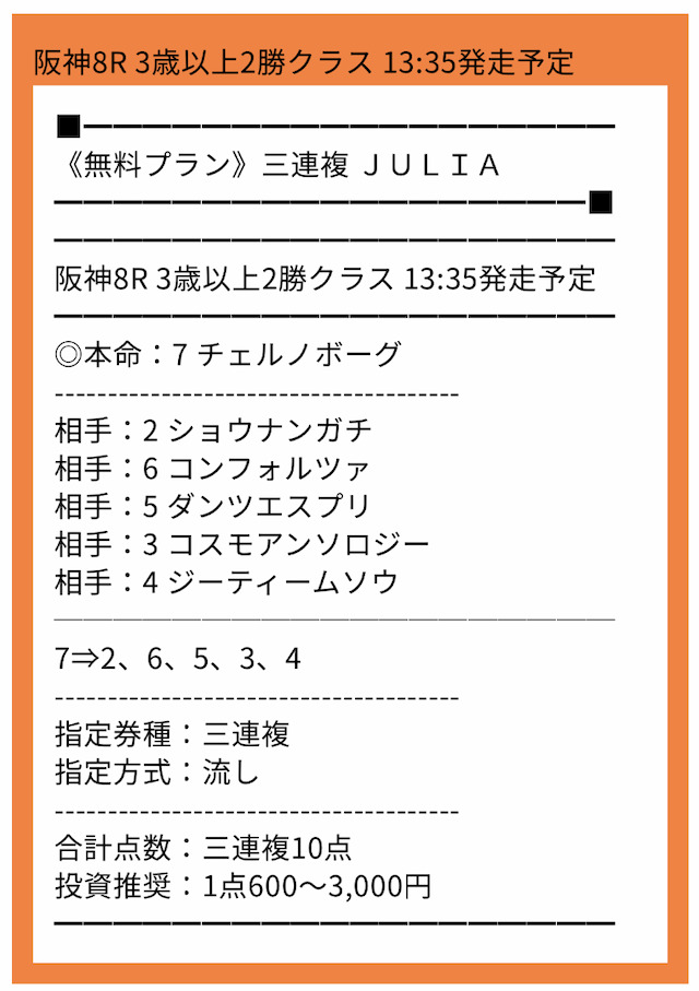 | 買い目点数 | 馬単・馬連:5点 3連複:10点 3連単:32点 |