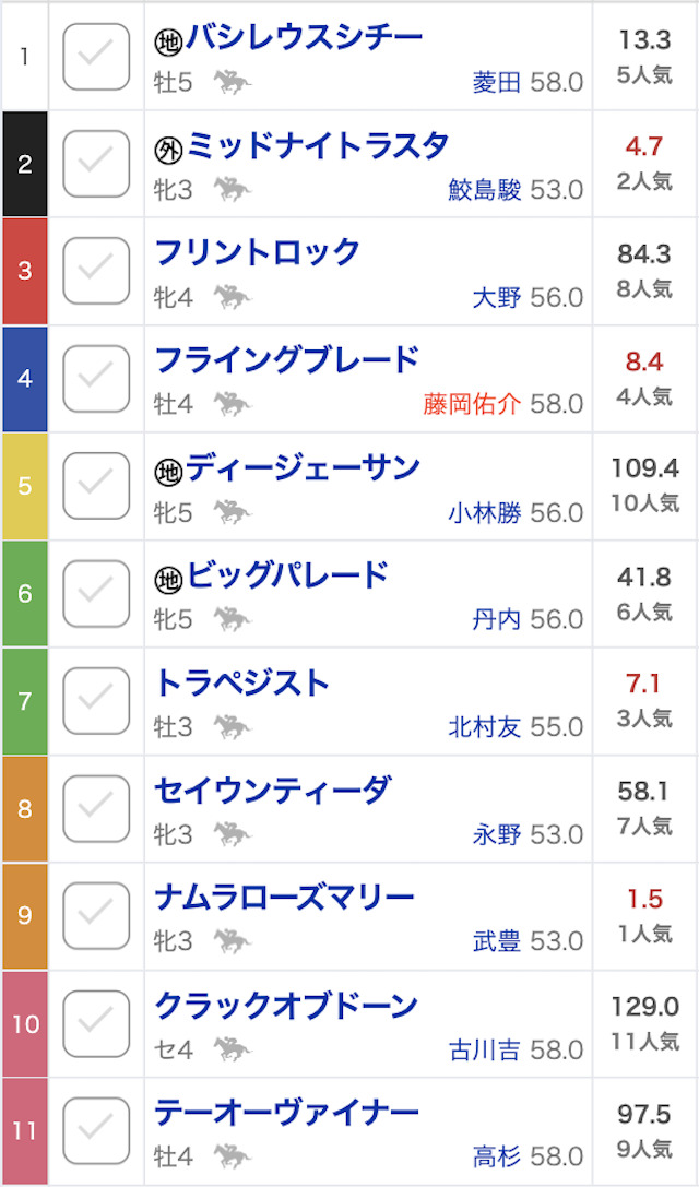 | ①バシレウスシチー | 5番人気 | 13.3倍 |