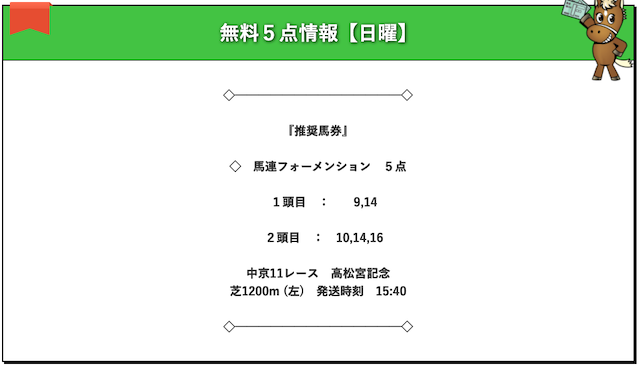 買い目は5点にしぼられており投資金額も高くならないため、自分の予想が当たらないという方はぜひ、めざまし万馬券の予想を試してみてはいかがでしょうか?