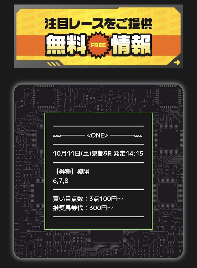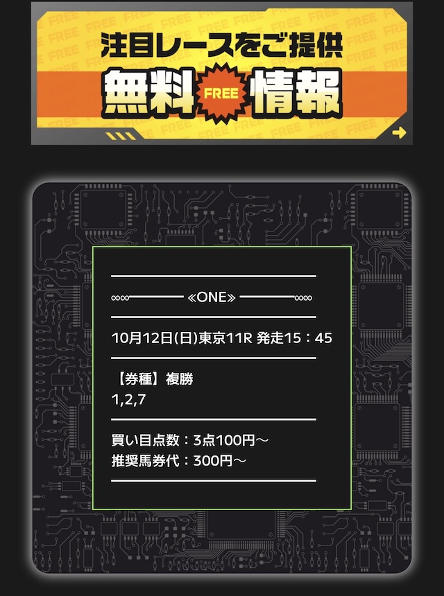 ONEの無料予想は、会員ページにある下記のバナーをタップするだけで受け取ることができました。