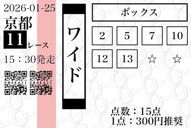 | 無料予想 | 提供:週末1レースずつ(週2回) 券種:ワイド |