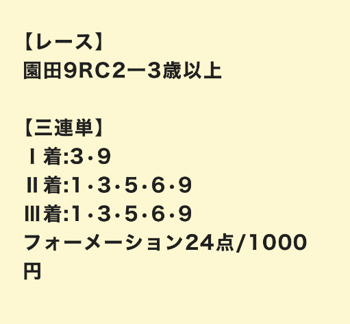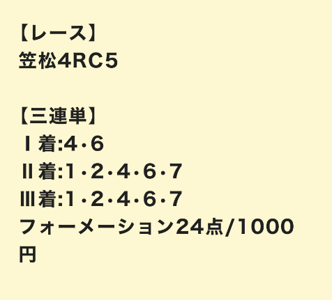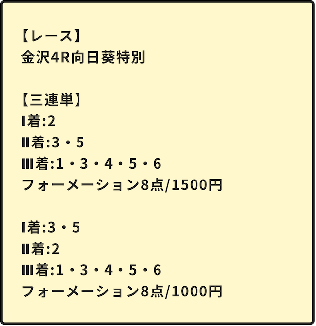 3連単が当たるのであればこれくらいは安いものですが、外す怖さも伴うギャンブラー好みの予想と言えますね。