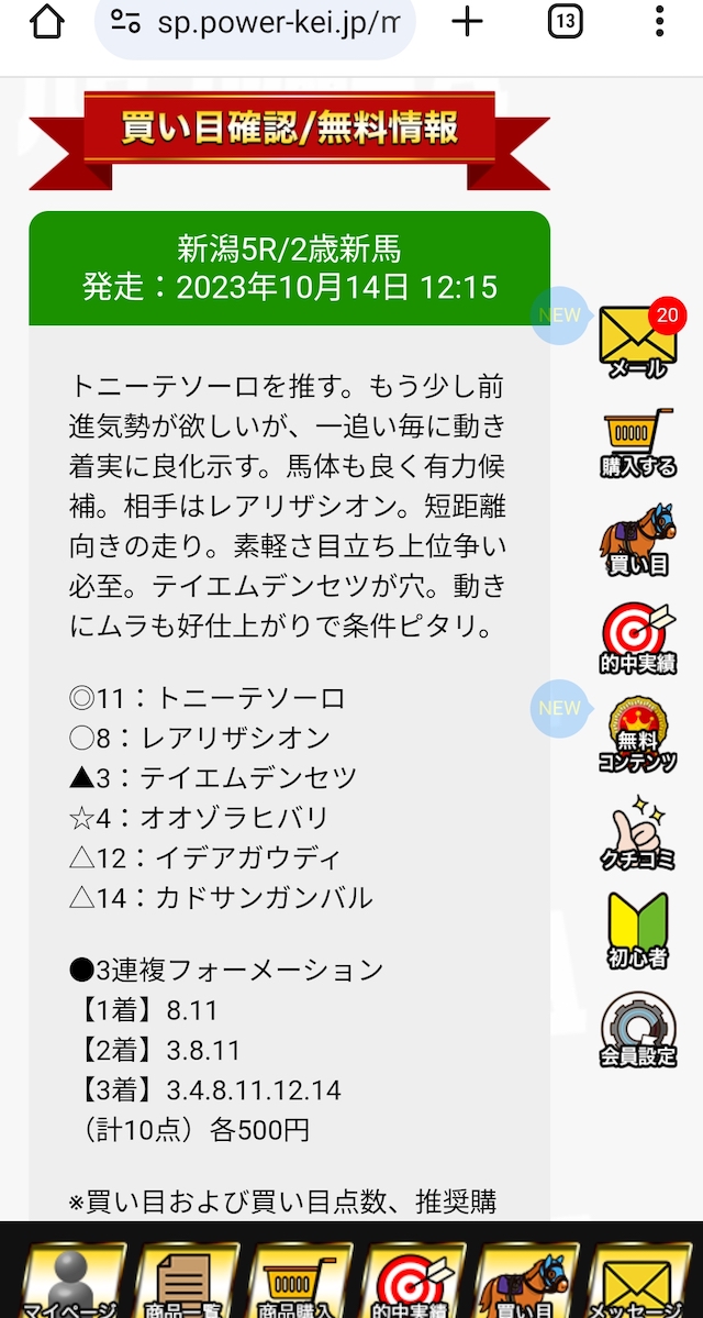 毎回ではないですが、高確率で中穴馬〜穴馬が絡む展開を読み当ててくれるので、1戦で判断するのではなく複数回利用してからサイトの実力を判断するようにしましょう。
