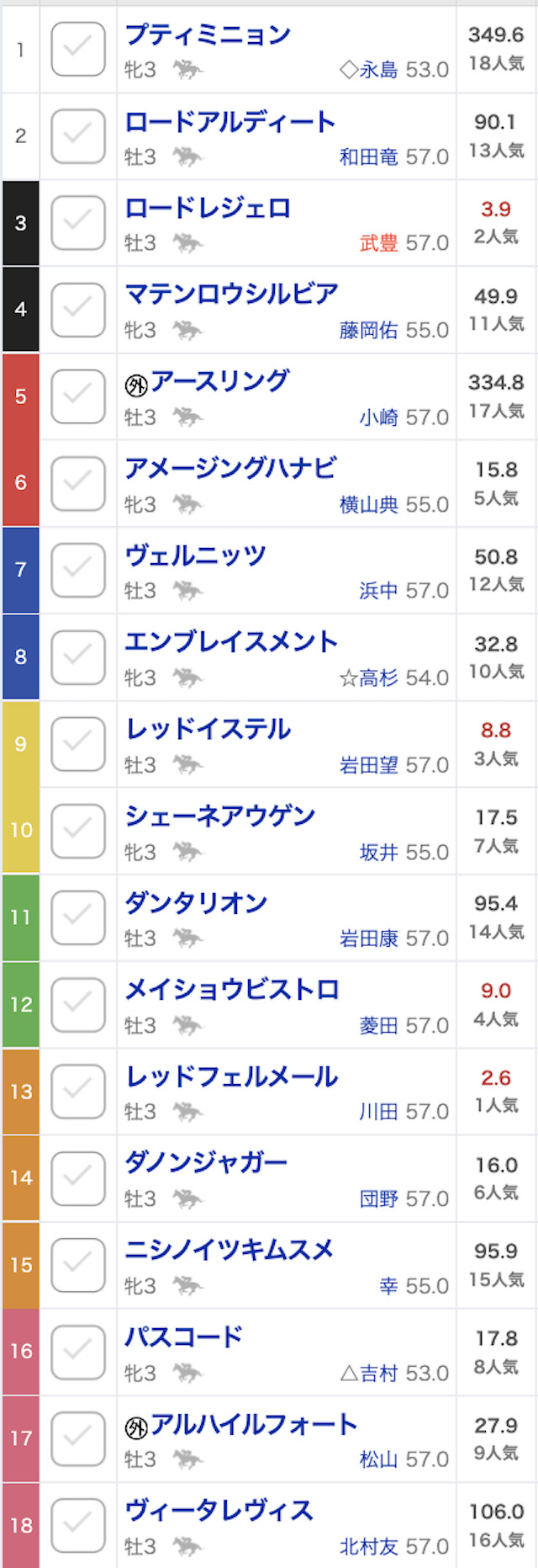 | 馬番・馬名 | 人気 | 単勝オッズ |