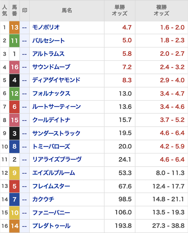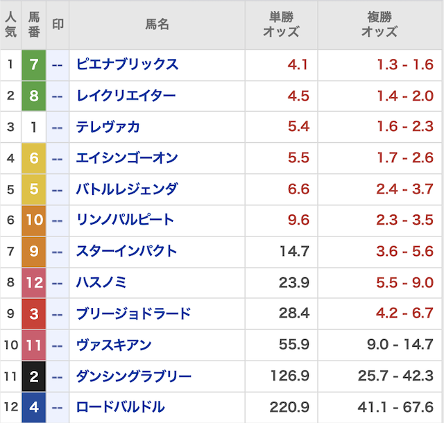 | 馬番・馬名 | 人気 | 単勝オッズ |