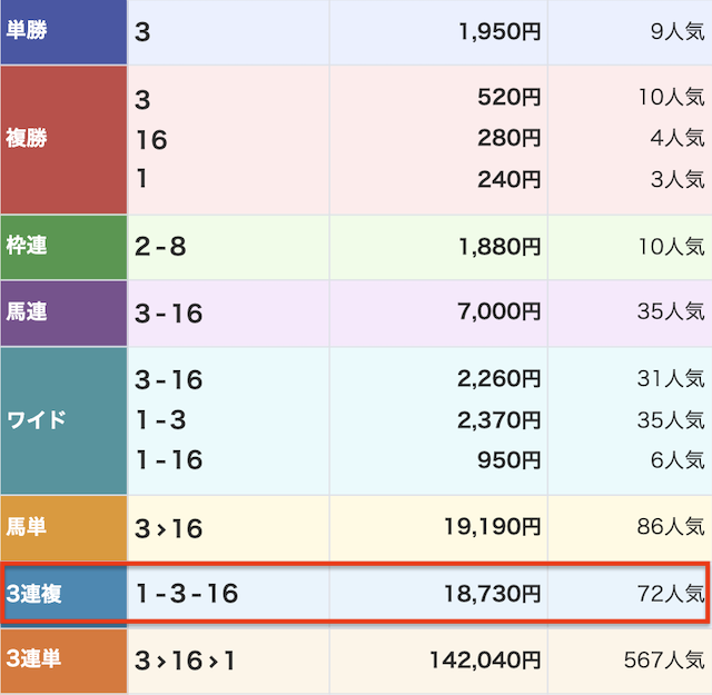 この券種であれば、軸に2,3,4番人気を据えて、相手には8,10,11番人気を選出することでトリガミを避けることが可能です。
