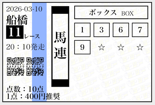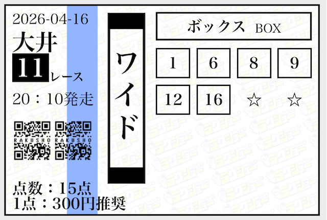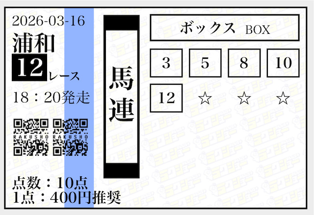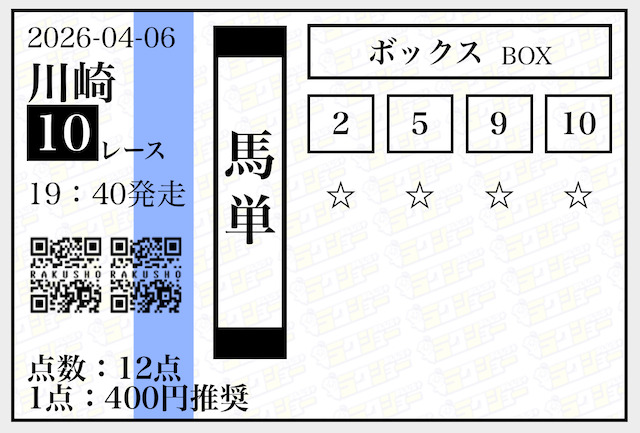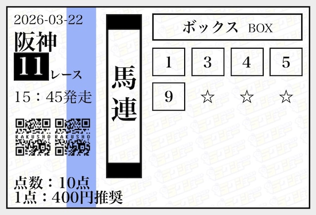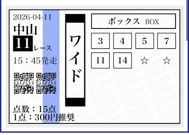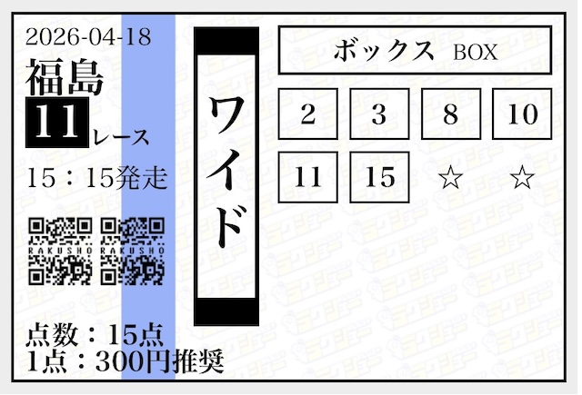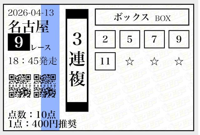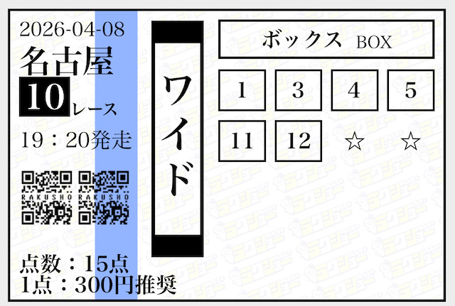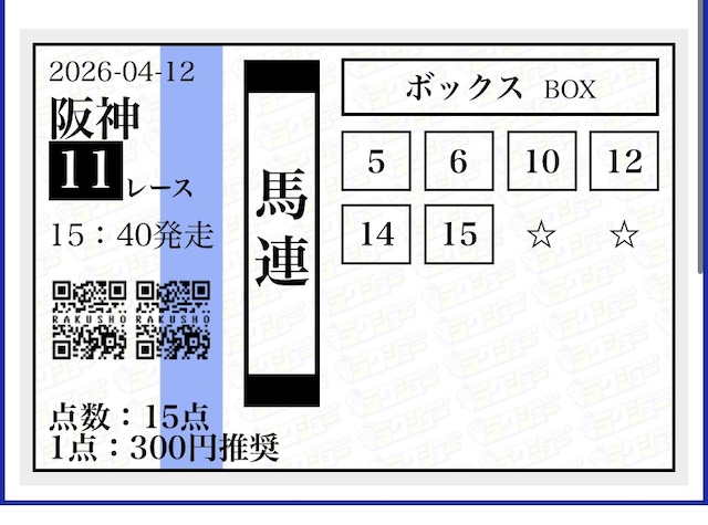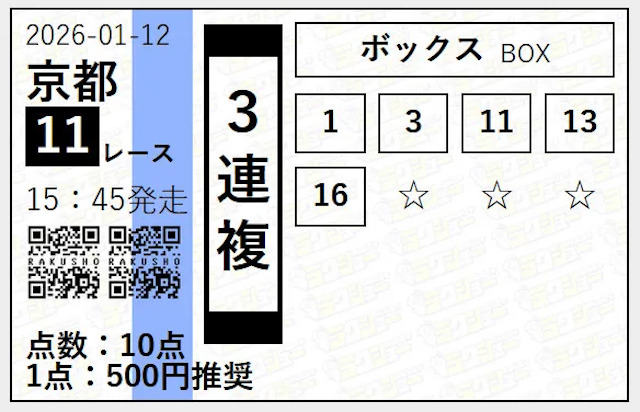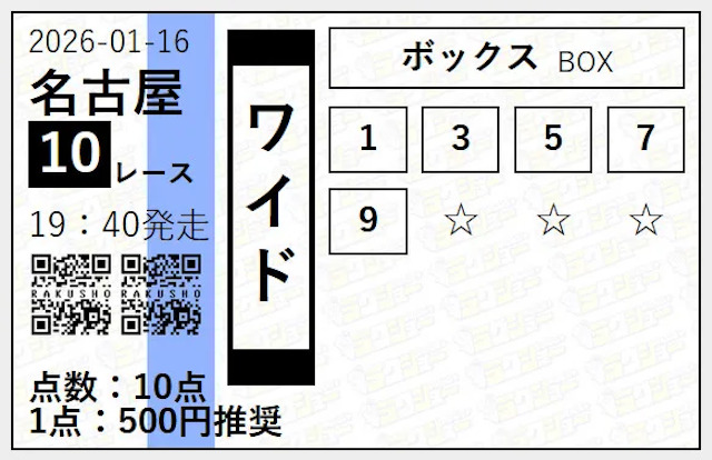 そんな中、本予想の券種は3連複ボックス、点数は10点で1点あたり500円を推奨している模様。