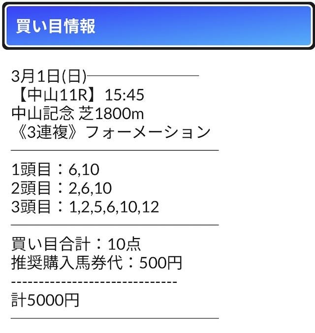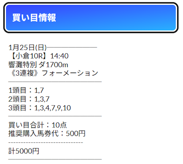 券種や点数は初戦と同じ「3連複5頭ボックス・10点」で公開されました。