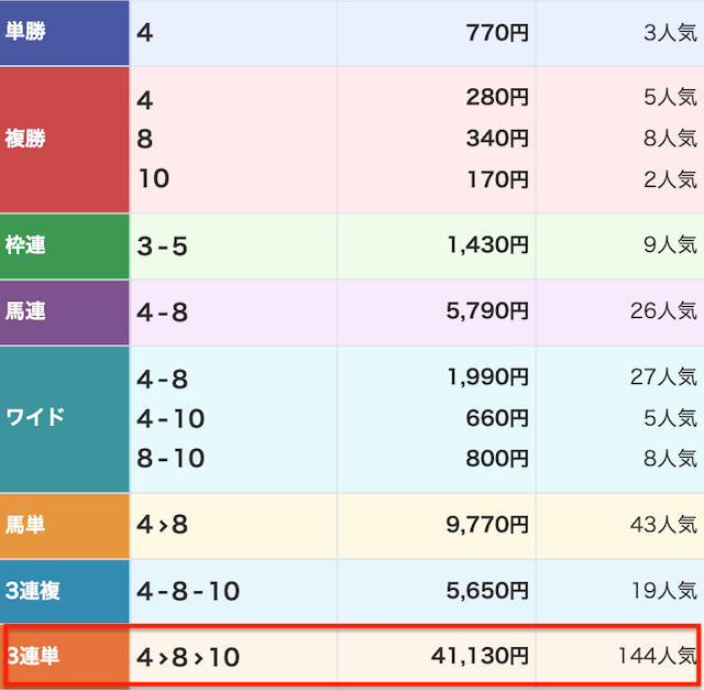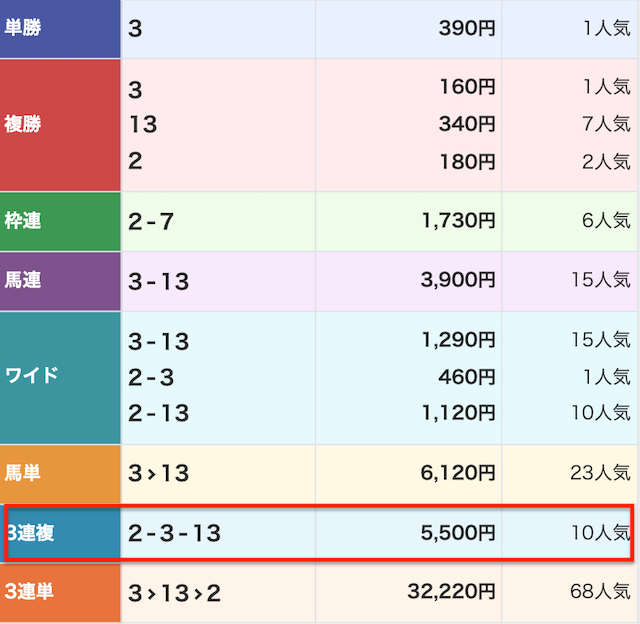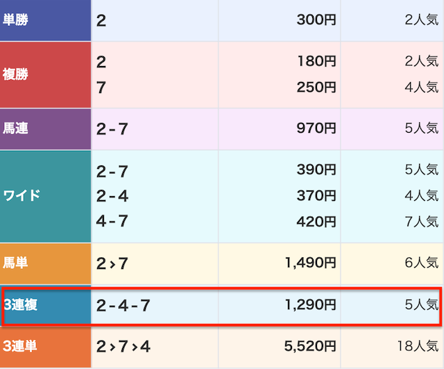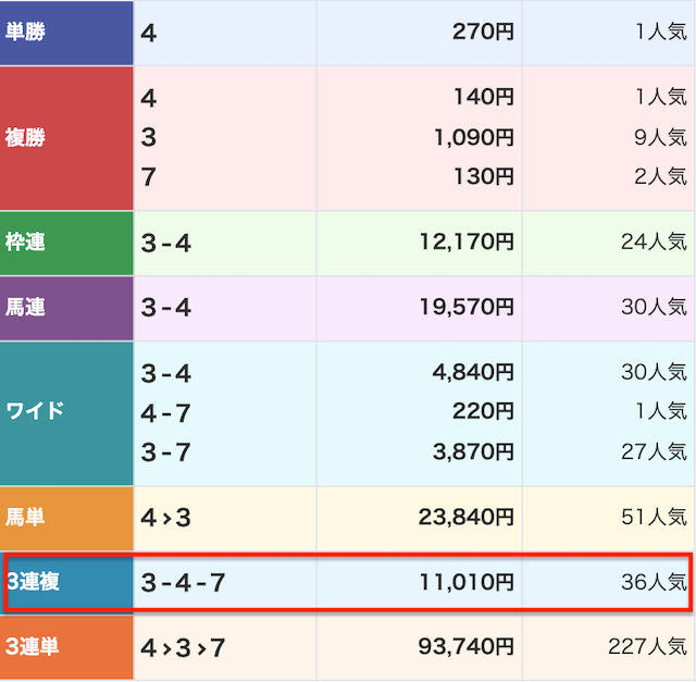 調べてみると、2,3,4番人気の決着になった時は12.9倍になるので、ぎりぎりトリガミは避けられそうでした。