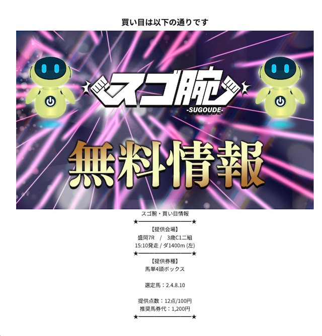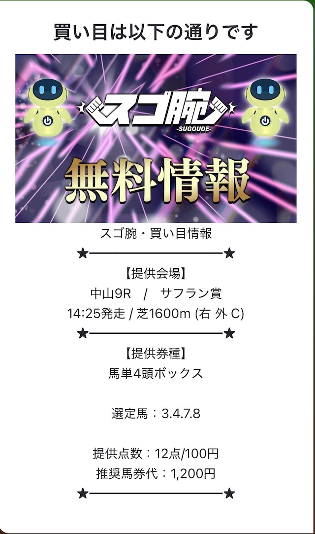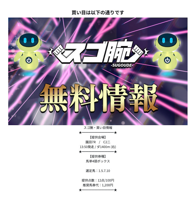 スゴ腕が用意していたのは、競馬予想サイトでは比較的一般的な「買い目予想」。