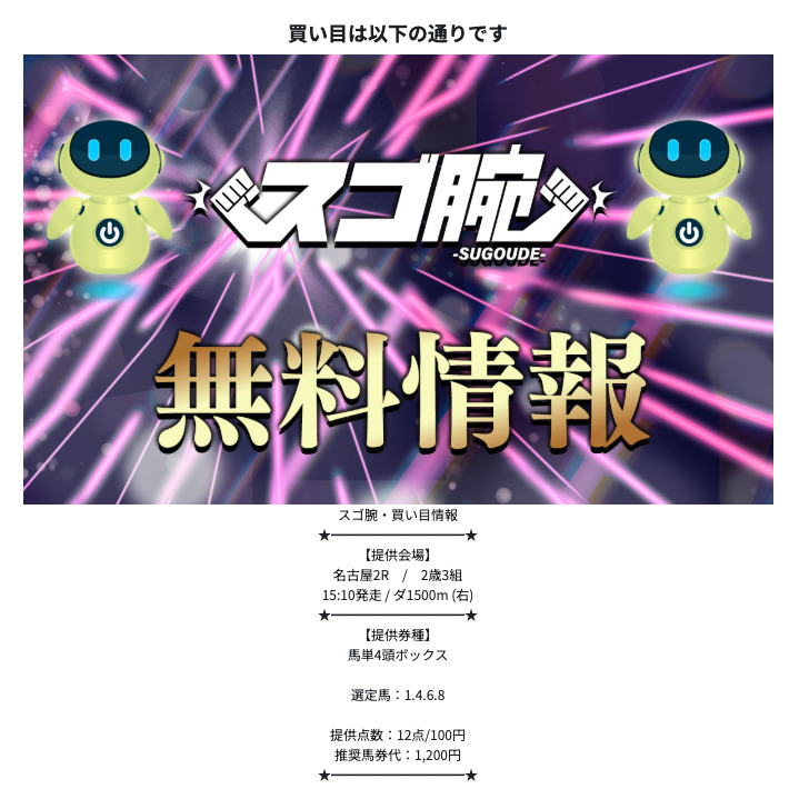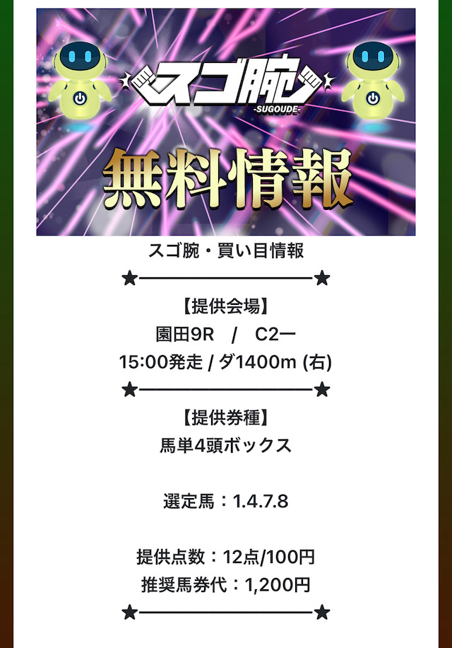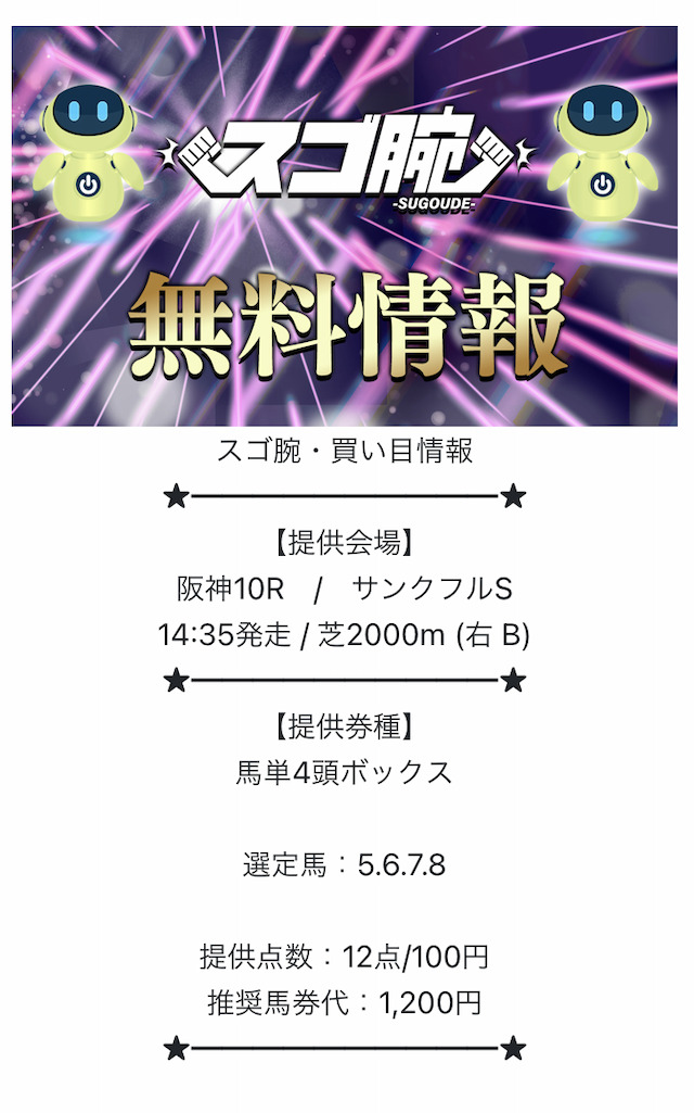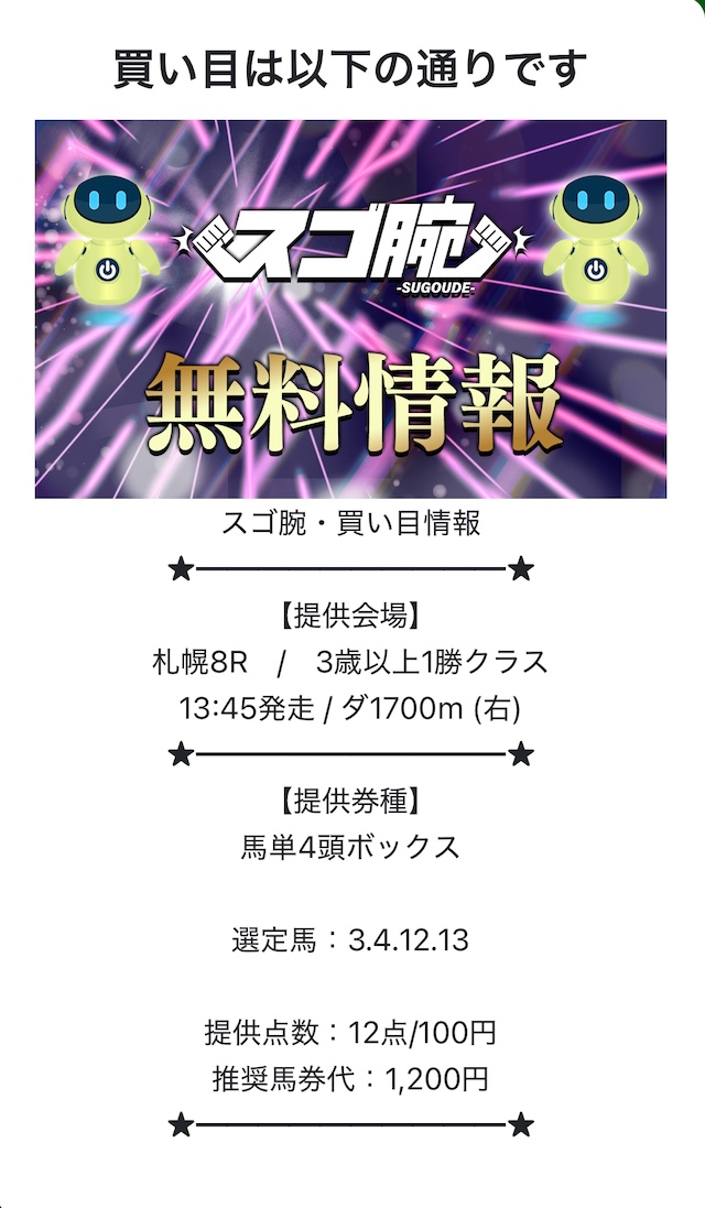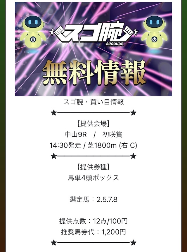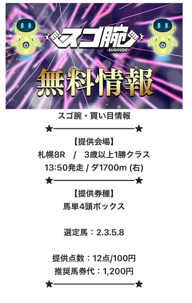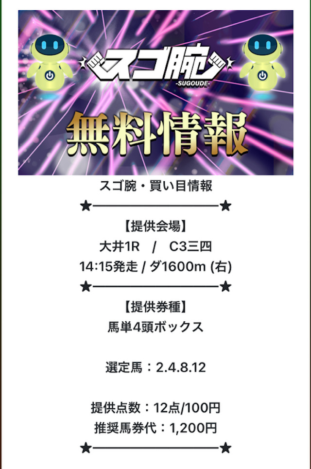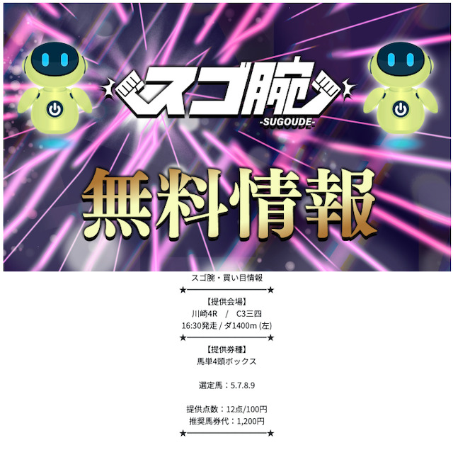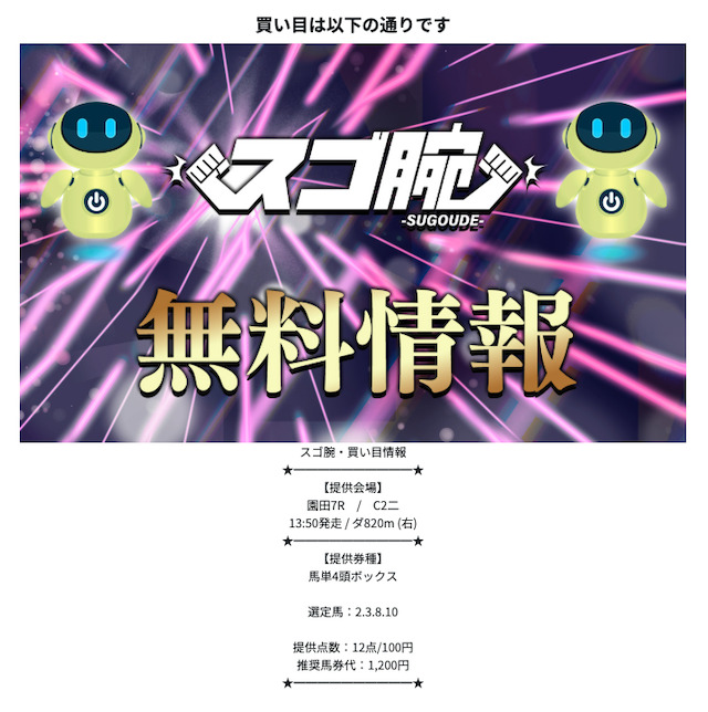 実際のところ、スゴ腕が掲げる“無料で遊べる”という部分に役立ちそうなのは無料予想の用意くらいだったので、その点は気になるところです。