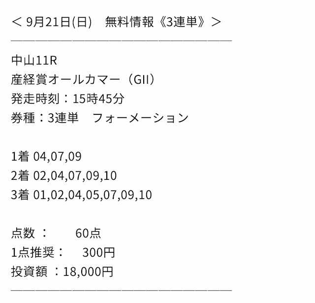普通に3連単を取り扱ってくれているので、ドカンとまとまったお金が入りやすいですね! 的中率や回収率も悪くないし、土日は競馬で稼ぎたいって平日にふと思ってフラッとサイトいっても普通に情報売ってくれてるから良い感じー