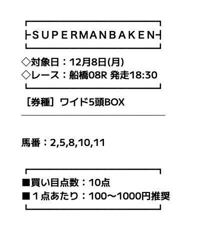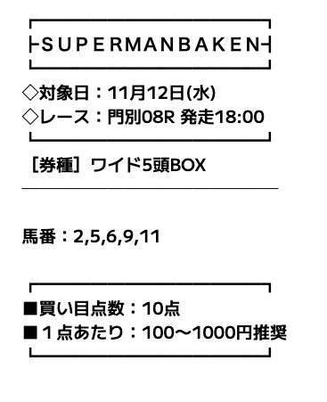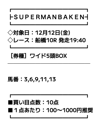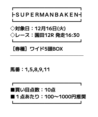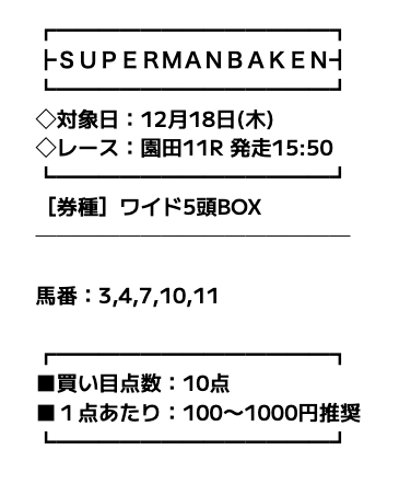 一方の有料予想はまさにスーパーマンバケンを象徴するような精度で、私の検証ではなんと1回の購入で約110万円の払い戻しを獲得。