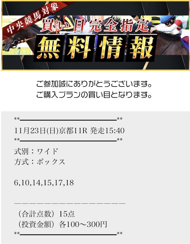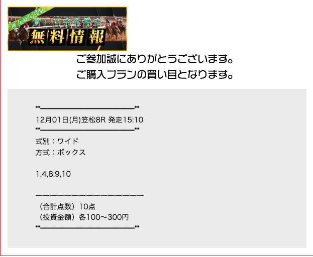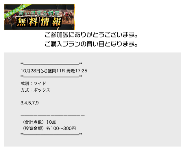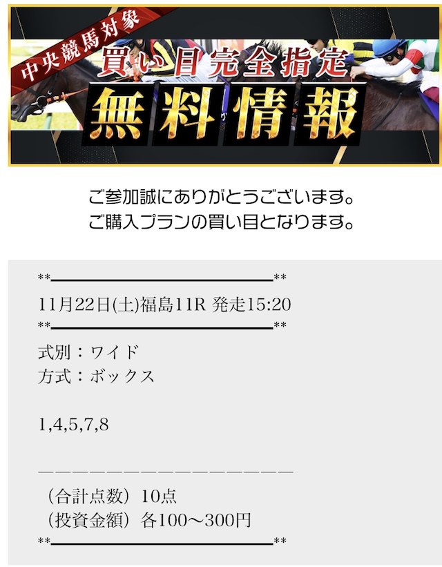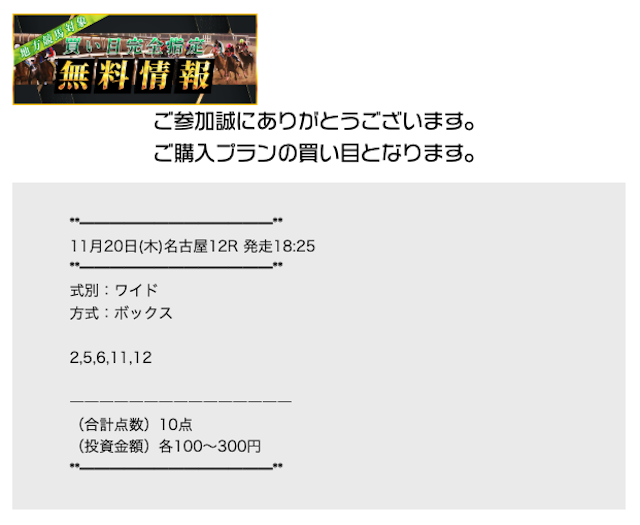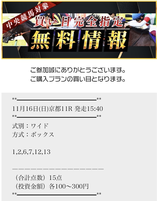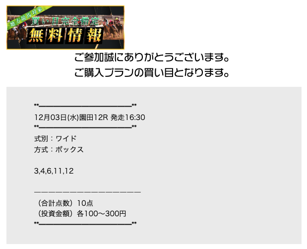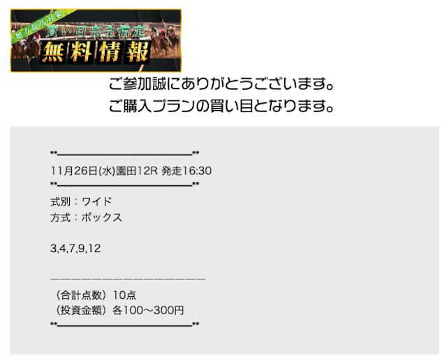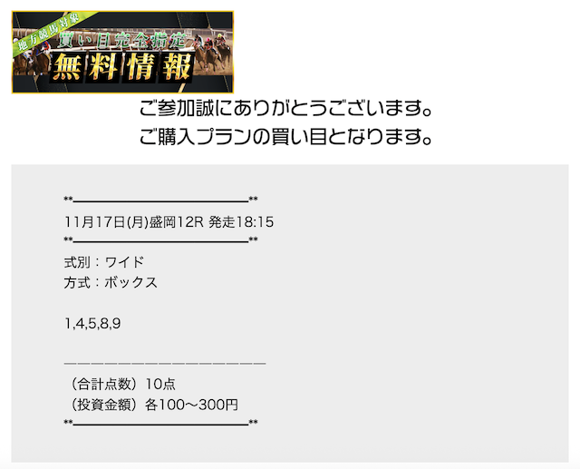 登録後に時間が合えば無料予想をすぐに受け取ることも出来ますので、ぜひチェックしてみてください。