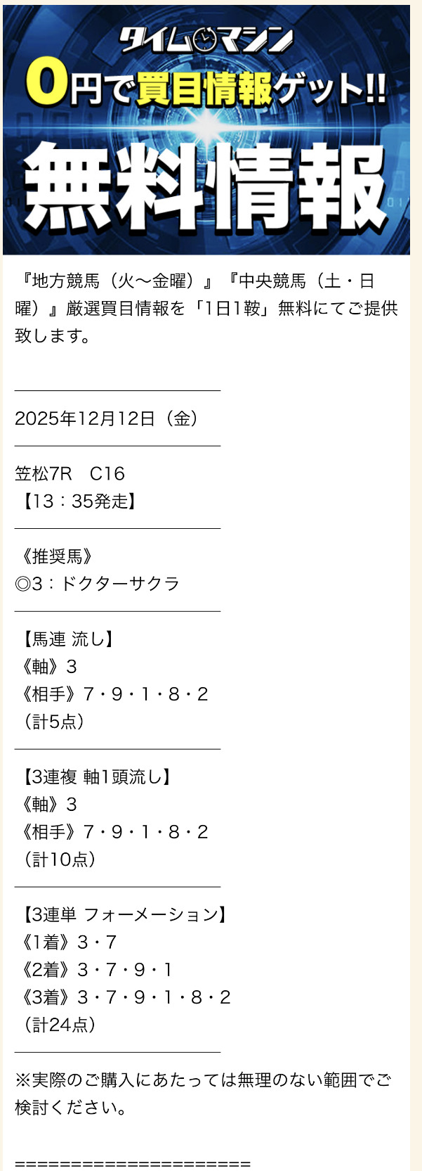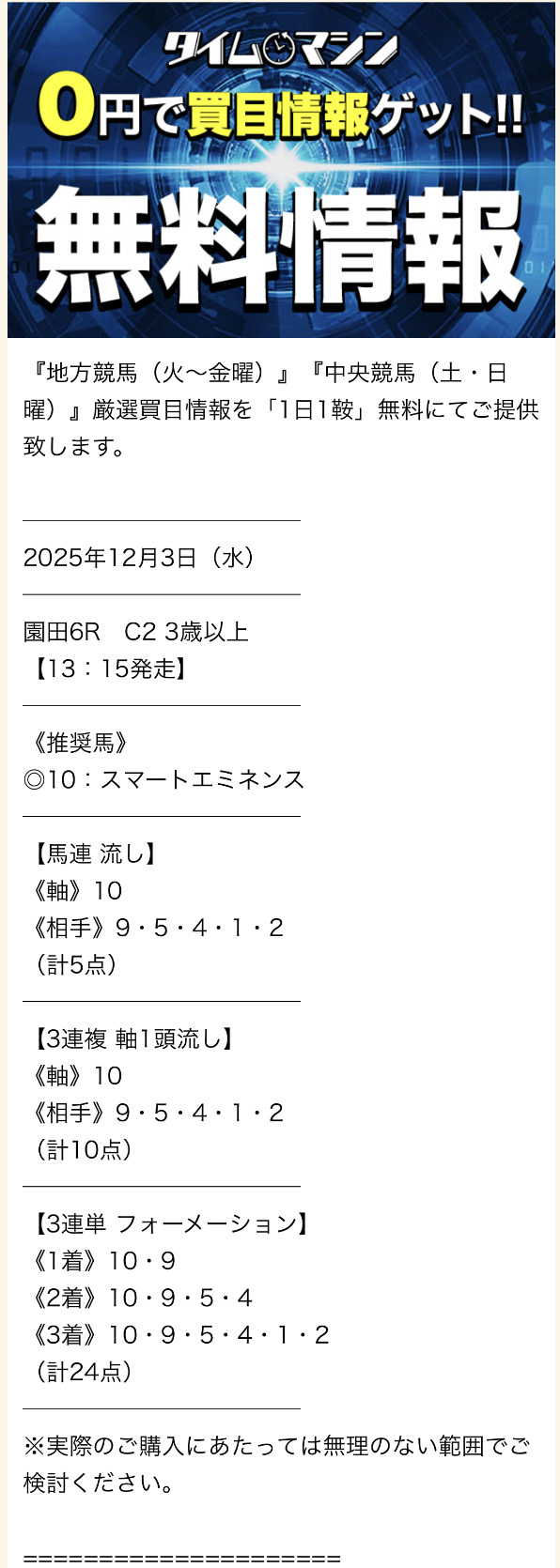 次に、タイムマシンの有料予想への参加レビューを公開します。
