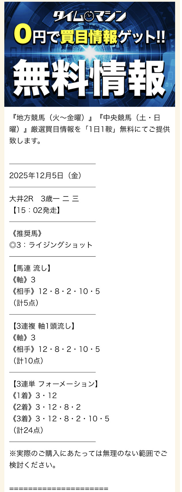 - 2025.10.25【無料予想】1撃15万円の払戻金獲得