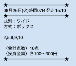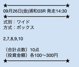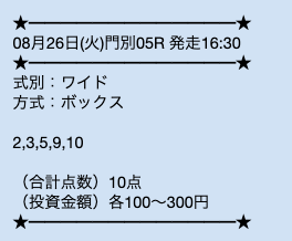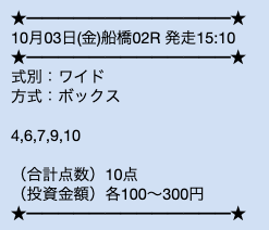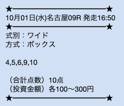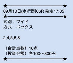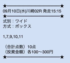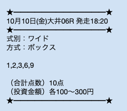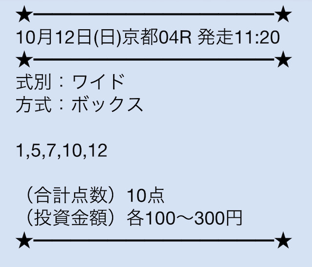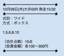 私の検証では1点あたりの最小投資を1,000円に設定しているので、今回は1,000円×10点で合計1万円の馬券を購入しました。