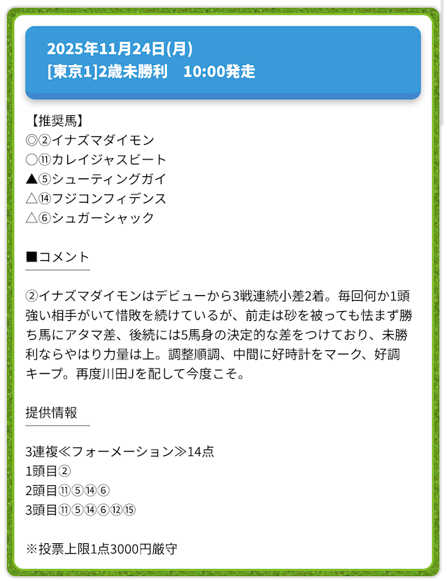 | 推奨投資金額 | 上限1点3,000円厳守 |
