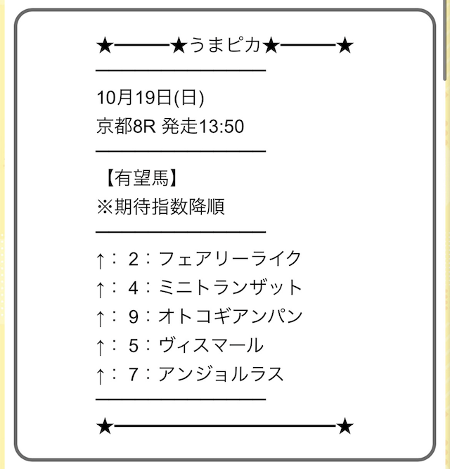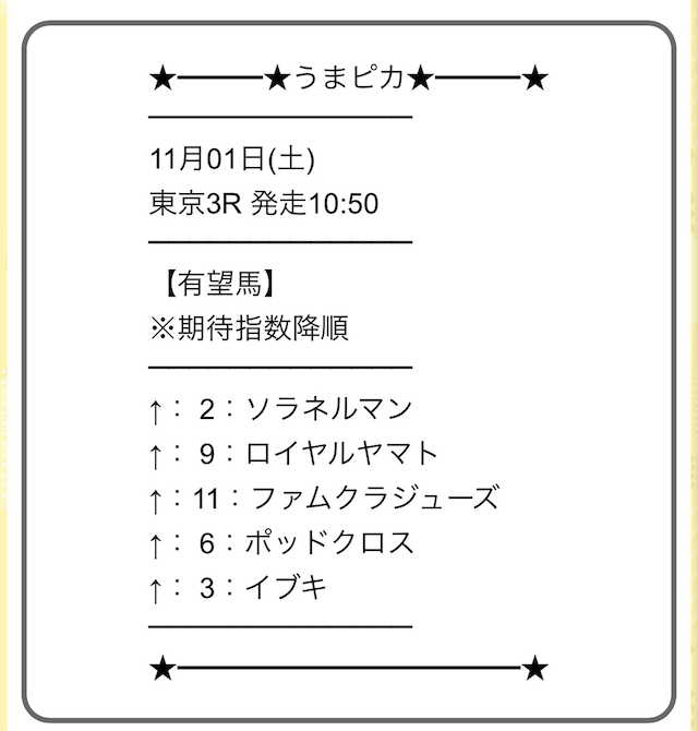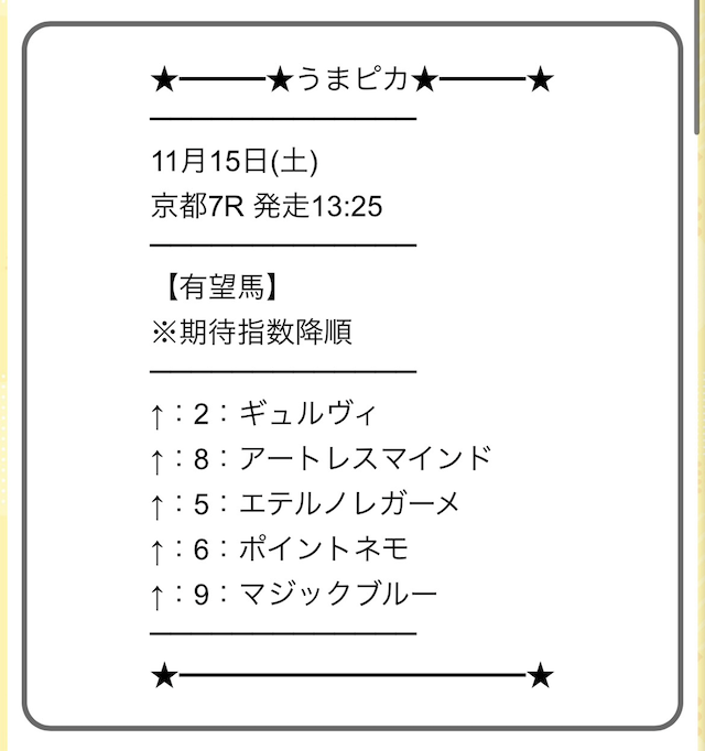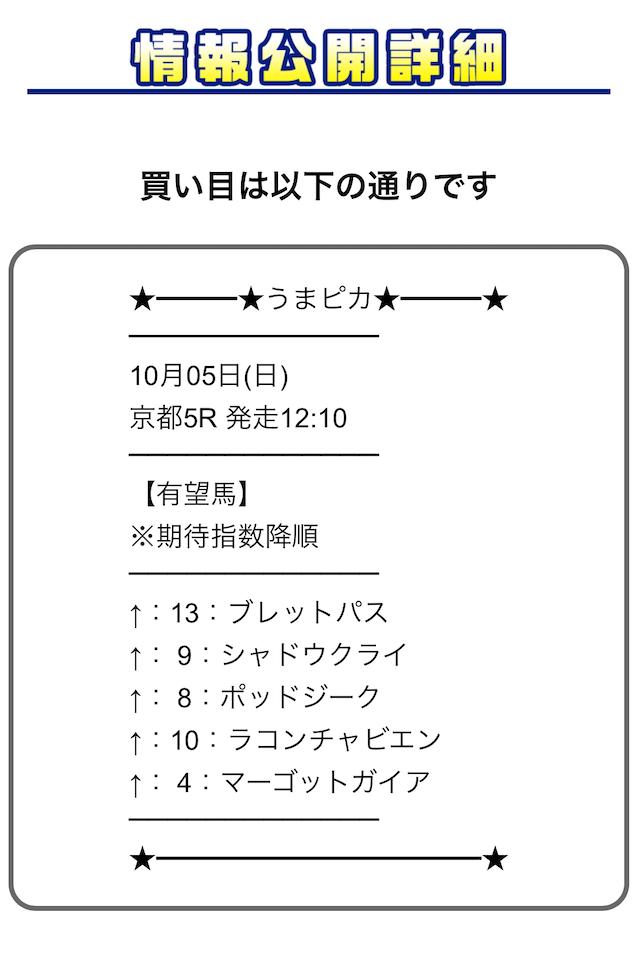 上から順に期待度が高い馬が記載され、買い目公開などとは異なり自由度が高いことが特徴です。
