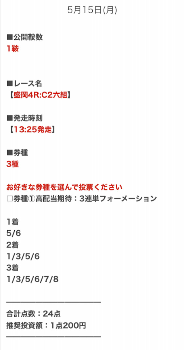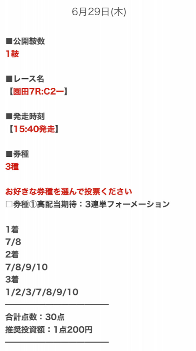 | 投資金額 | 1レース30,000円前後 |