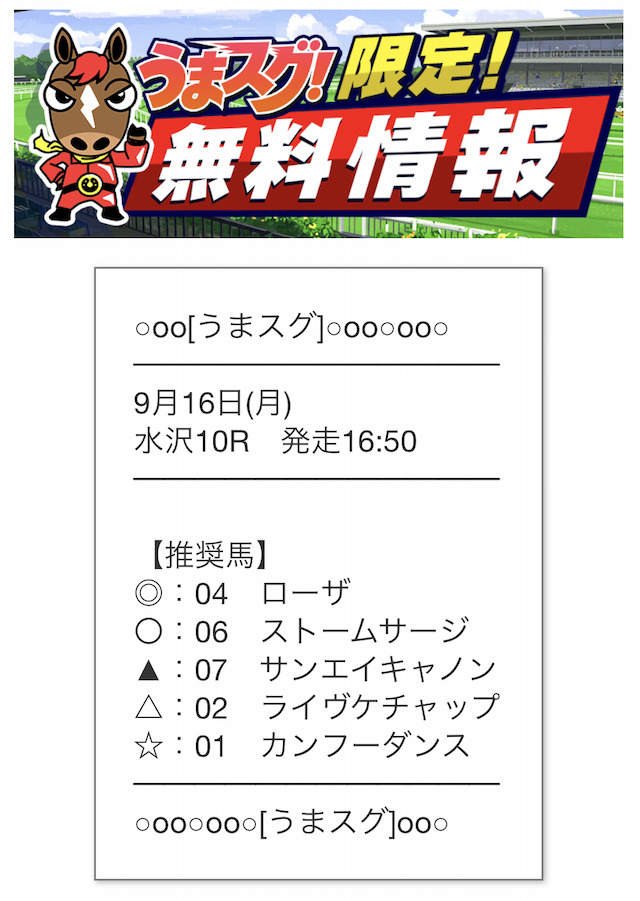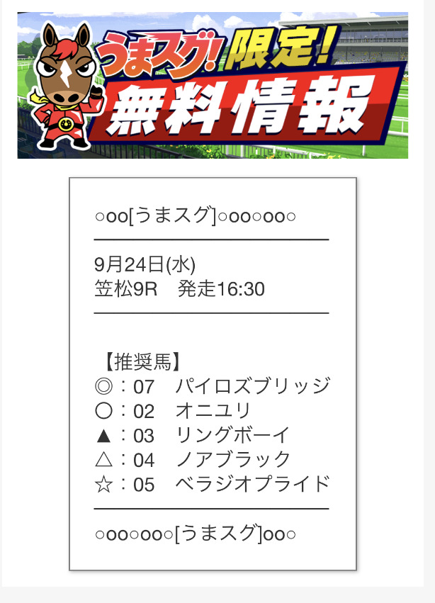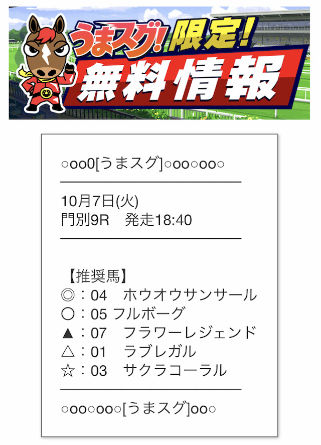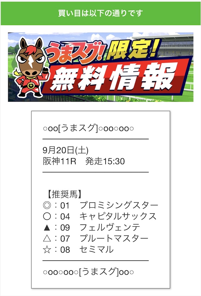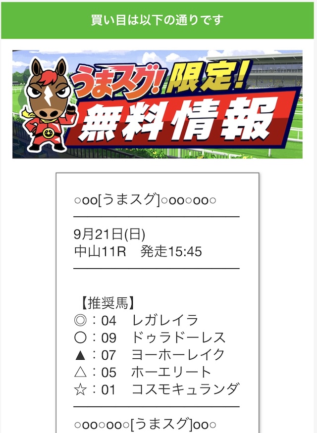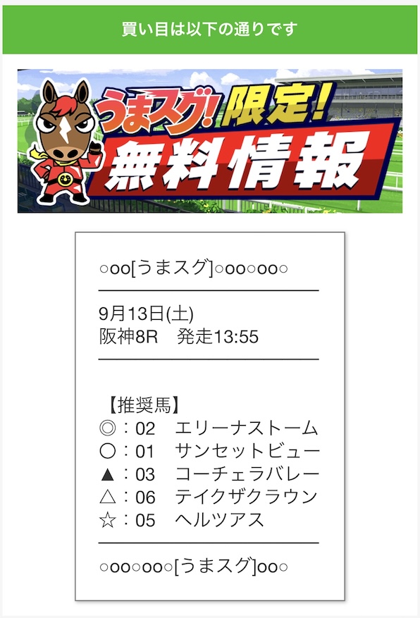 この記事見てうまスグ使ってみましたが、管理人さんが言う通りすごいサイトでしたw初戦は負けてしまったんですけど、そこから5連勝wしかもそのうちの1レースは万馬券もらって、9万勝ちです。相当良いサイトに出会えました。まだまだ稼いでもらいます!!