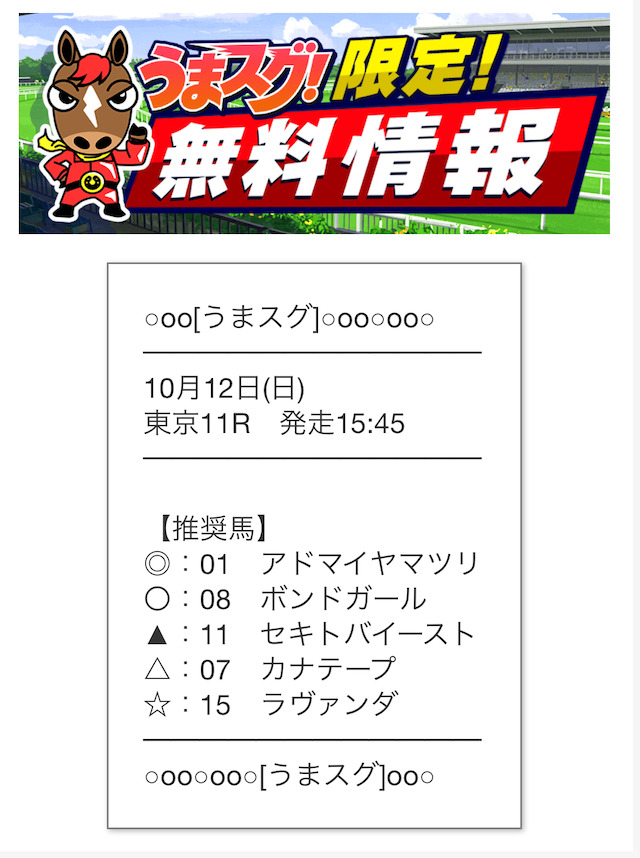 自分、ポイント使ってうまスグの有料予想勝ってみましたが、一番安いプランでも50万以上稼げたので、初回限りでも絶対参加したほうが良いと思います。ちなみに、自己負担は15,000円でした。無料予想1回当たればこれくらい稼げるんで、当たった人試してみてください。