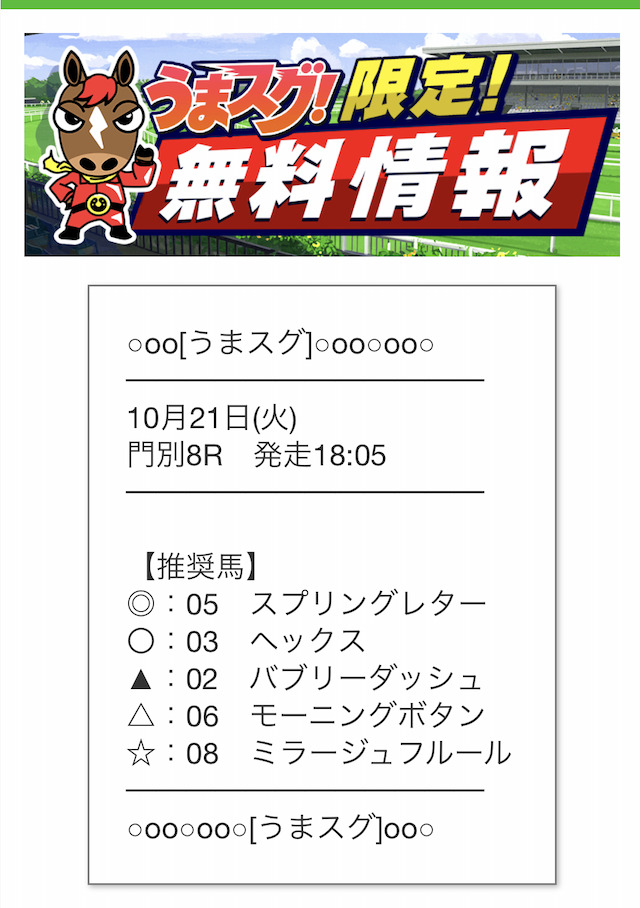 無料予想だけ使ってみましたが、とんでもないですねこのサイト。初回から10万弱勝てて、そのあとも3連勝。本当に見つけてよかったです。これからも活躍してくれたらまたレビュー書きに来ます。