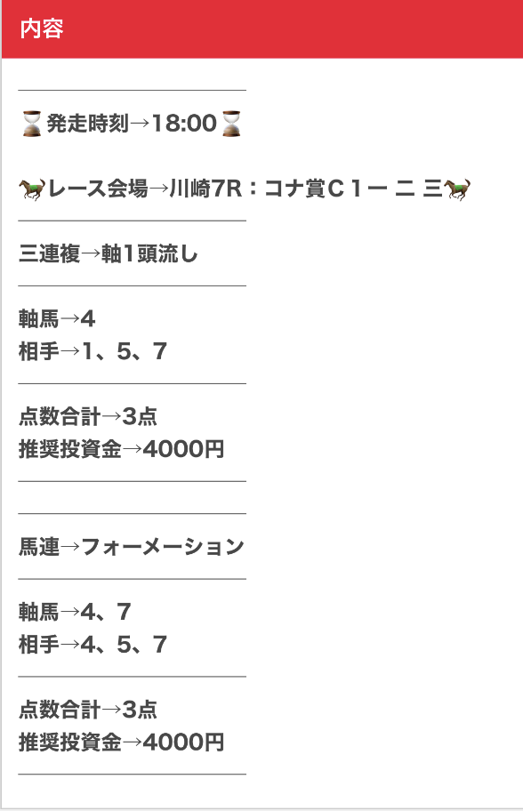 無料予想 有料予想 稼ぎやすさ 安定感 ★4 ★1 ★4 ★4 コスパ 使い勝手 サポート コンテンツ ★4 ★3 ★3 ★3 予想がちゃんと当たってるのは良いんだけど、エントリーが面倒くさすぎるww前も似たようなサイト使ったことあるけど、これ事前になんかする必要あんのかな?普通に予想公開すれば良いやんって思ってるんだけどwまあ当たるなら良いんだけどねww