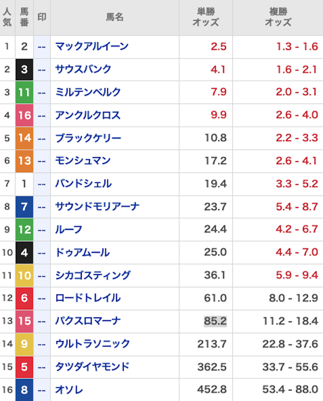| ⑮パクスロマーナ | 13番人気 | 85.2倍 |