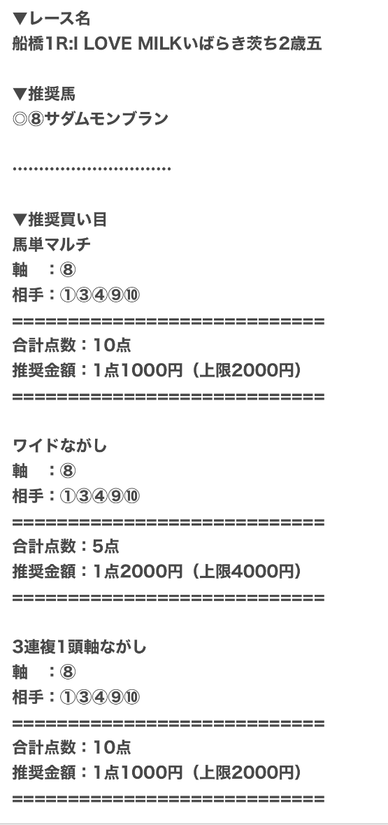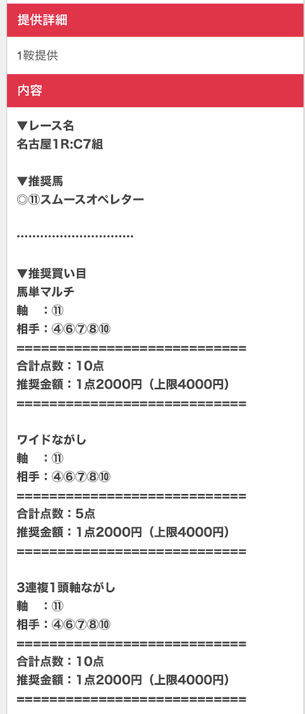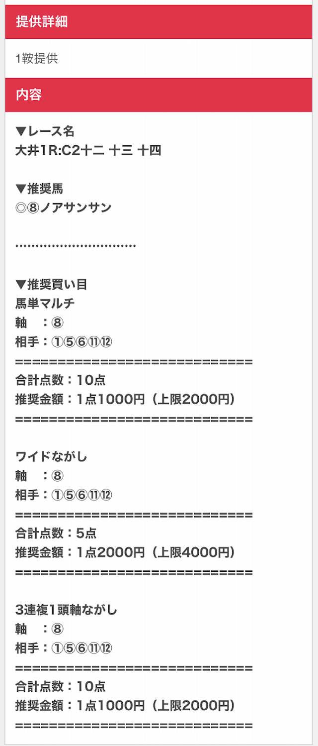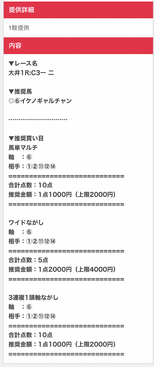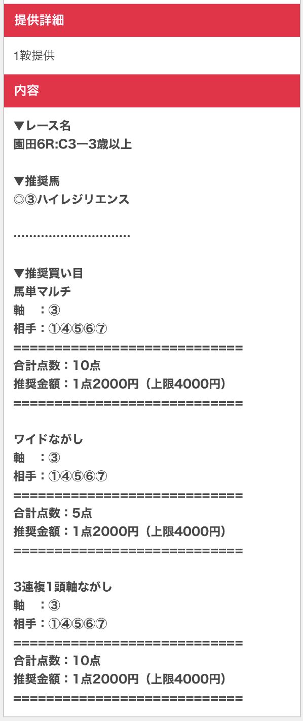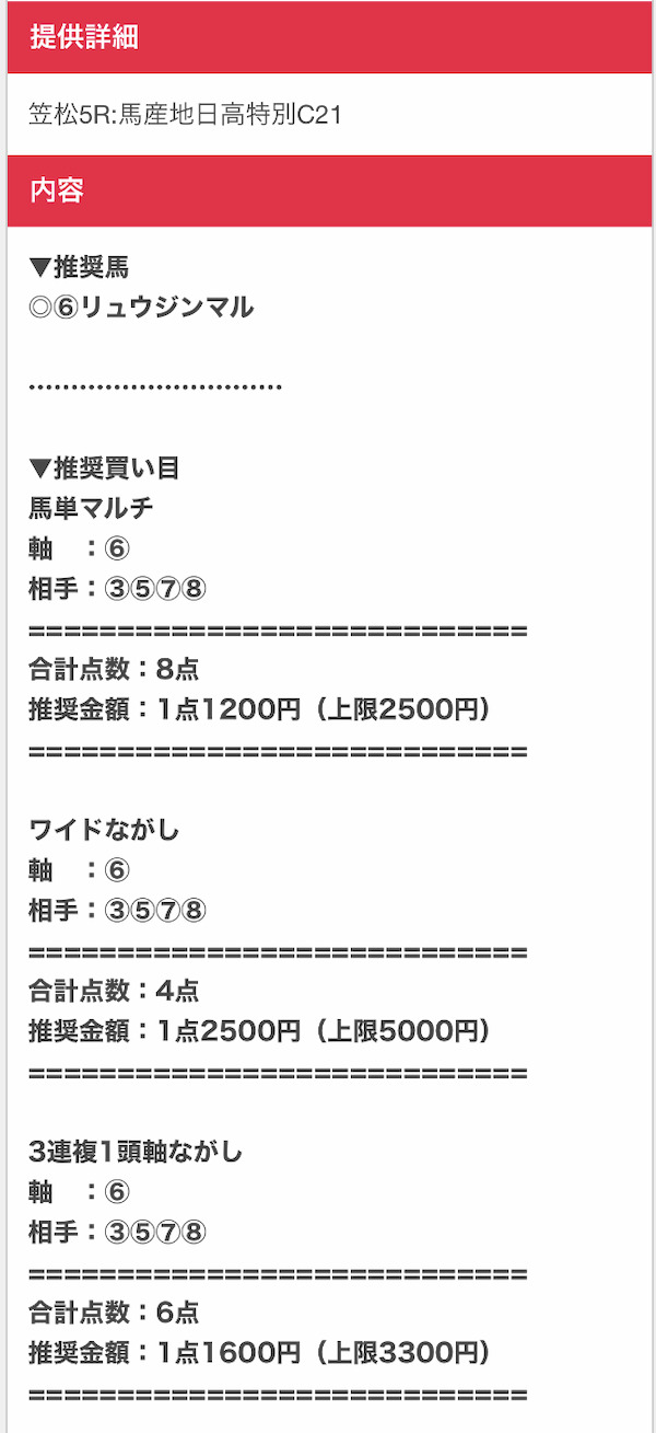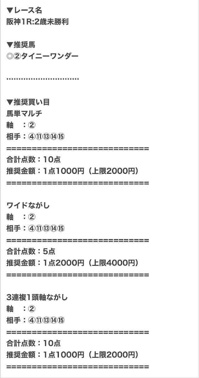 まずは実際に公開される買い目の例をご覧ください。