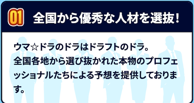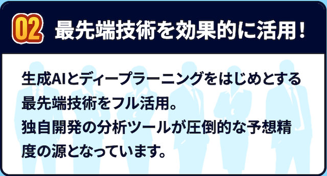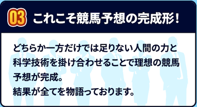 要約すると、全国各地から選ばれたプロの馬券師と最新技術をかけ合わせて当たる予想を提供しているとのことでした。