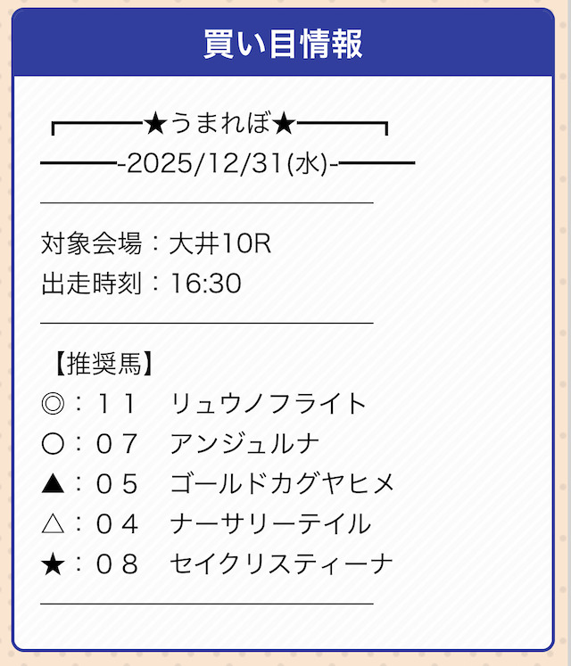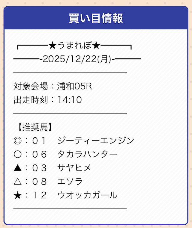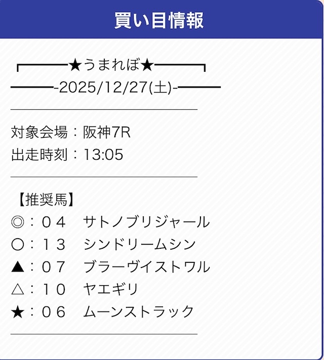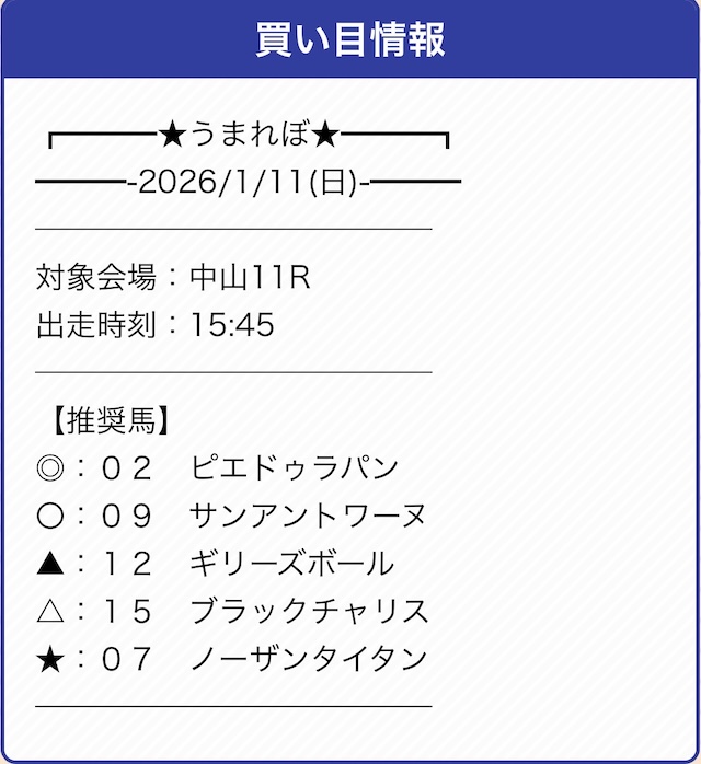 券種や点数には指定がなく、「予想印」で買い目が提供されていました。