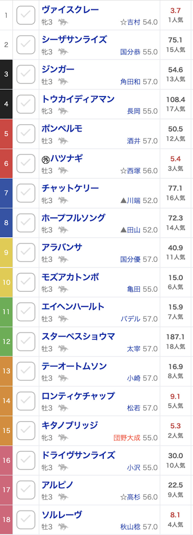 馬番・馬名 | 人気 | 単勝オッズ |