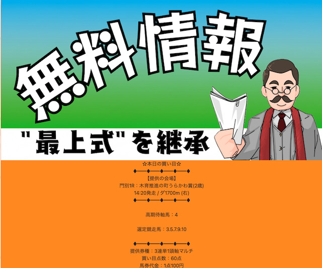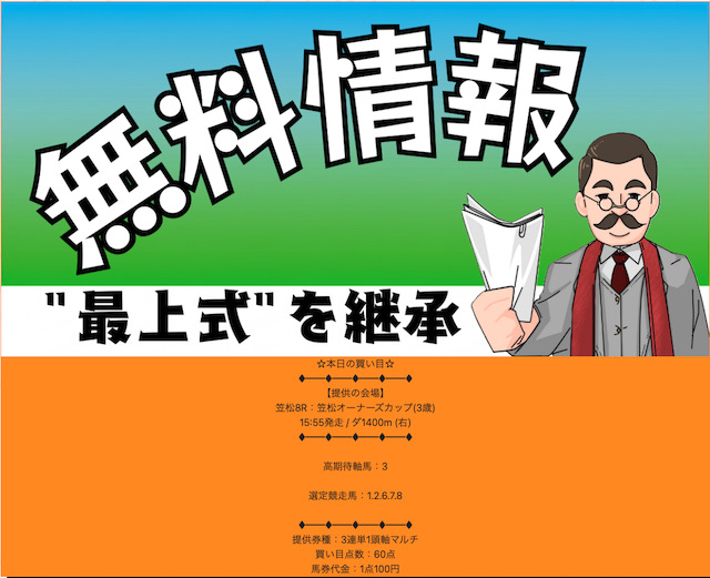 最上式勝馬投票券は、監修者である「最上幸造氏」が作成したロジックやノウハウを用いた競馬予想をユーザーに提供するという競馬予想サイト。