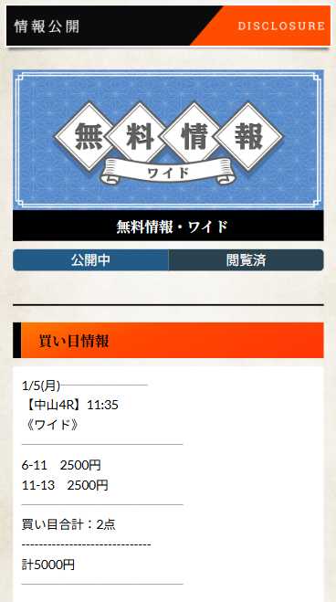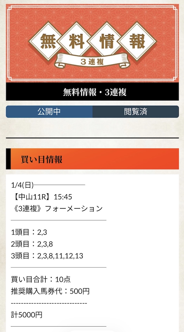 ニックネーム登録するとポイントが貰えるキャンペーンがあって、有料情報を無料で見ることができる!私が参加した時はこの予想で30万円の払い戻しになって、今はその資金を元に有料プランに参加してます!