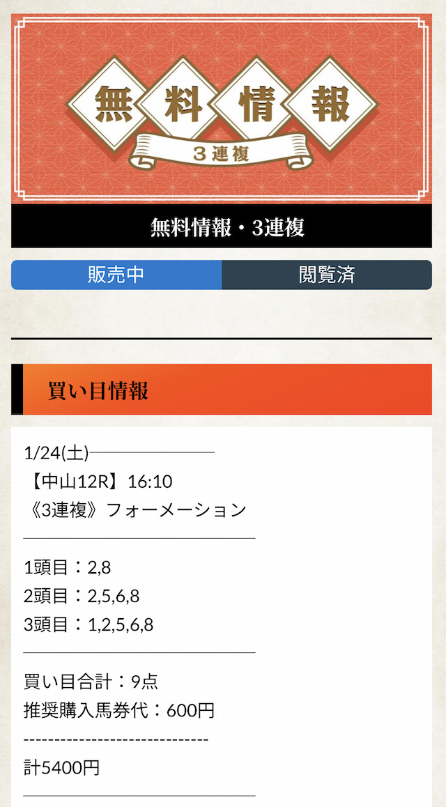ニックネーム登録するとポイントが貰えるキャンペーンがあって、有料情報を無料で見ることができる!私が参加した時はこの予想で30万円の払い戻しになって、今はその資金を元に有料プランに参加してます!